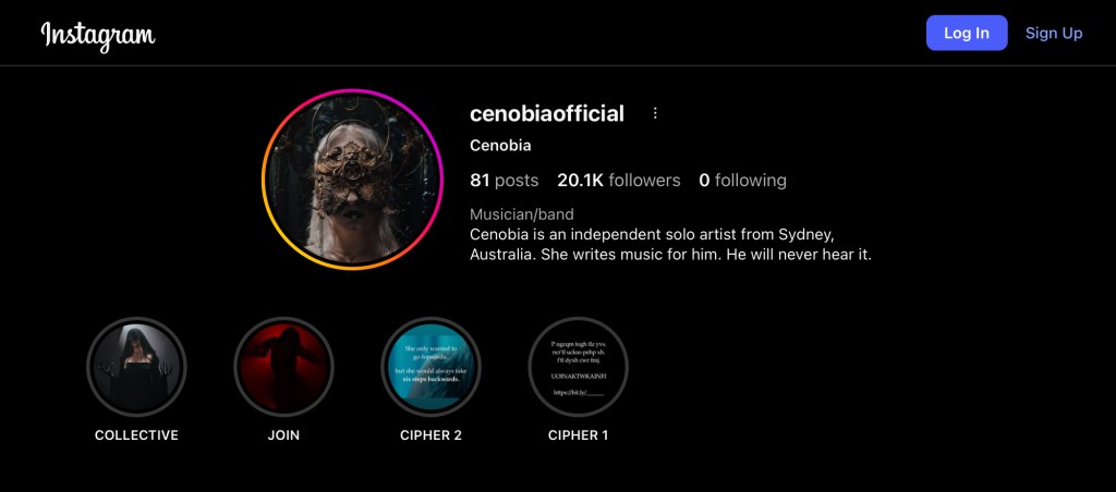 On her social media accounts, Cenobia has employed a world-building Alternate Reality Game (ARG) to engage her audience.